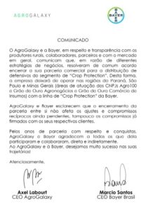 O AgroGalaxy e a Bayer, em respeito e transparência com os produtores rurais, colaboradores, parceiros e com o mercado em geral, comunicam que, em razão de diferentes estratégias de negócios, resolveram de comum acordo encerrar a sua parceria comercial para a distribuição de defensivos do segmento de “Crop Protection”. Desta forma, a empresa deixará de operar nas regiões do Paraná, São Paulo e Minas Gerais (áreas de atuação dos CNPJs Agro100 e Grão de Ouro Agronegócios e Grão de Ouro Comércio de Insumos) com a linha de “Crop Protection” da Bayer. AgroGalaxy e Bayer esclarecem que o encerramento da parceria entre si não afeta os ajustes e compromissos recíprocos ainda pendentes, tampouco os compromissos já firmados com os seus respectivos clientes. Pelos anos de parceria com respeito e conquistas, AgroGalaxy e Bayer agradecem a todos os que dela participaram e colaboraram, direta e indiretamente. Ao AgroGalaxy e à Bayer, desejamos muito sucesso nas suas trajetórias! Atenciosamente,