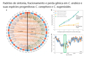 Evolução do café arábica – Com os novos mapeamentos genéticos, foram realizadas comparações das sequências e estruturas completas do genoma das espécies Coffea arabica, Coffea eugenioides e novamente do Coffea Canephora. O objetivo foi revelar a evolução das espécies, a função dos genes, o mecanismo de regulação dos genes, identificando as estruturas de sequência e os elementos que se conservaram ou se diferenciaram. Foram realizadas ainda as análises sobre a família dos genes, o desenvolvimento evolutivo, a duplicação de todo o genoma, e a pressão seletiva sofrida.