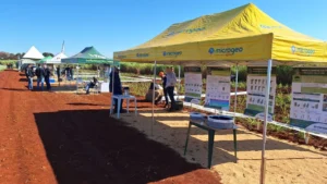 Entre elas, um dos expositores da Estação de Nutrição, a Massari, especialista em fertilizantes minerais, mostrou a diferença prática entre tratamentos convencionais e orgânicos. Em abril, foram realizados o plantio de dois plots, um com um tratamento convencional e outro orgânico. “Ambos contém calcário, gesso, fósforo, potássio, boro e zinco. A única coisa que diferencia um do outro é a forma de aplicação do gesso. Em um splot, o gesso está em resíduo, que vem da indústria. Do outro, diretamente da gipsita, que é o gesso natural, somente moído”, contou Cláudio Monteiro, químico responsável pela área de Desenvolvimento e Pesquisa da empresa.