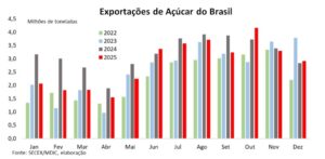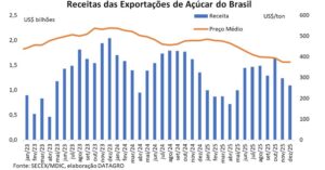 Apesar do elevado volume exportado, a receita foi impactada pela queda dos preços internacionais e pela variação cambial. Em dezembro, o valor médio do açúcar exportado caiu para US$ 374,55 por tonelada, o menor patamar desde novembro de 2021, levando a uma retração de 19,4% na receita mensal. No acumulado do ano, a receita totalizou US$ 14,109 bilhões, queda de 24,2% em relação a 2024.
