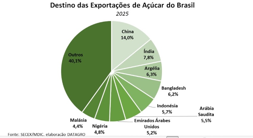 A China liderou as compras em 2025, com 4,739 milhões de toneladas, crescimento de 56,9%, seguida pela Índia e pela Argélia. Mesmo em um ano de preços mais pressionados, os números confirmam a força estrutural do Brasil no comércio internacional de açúcar.