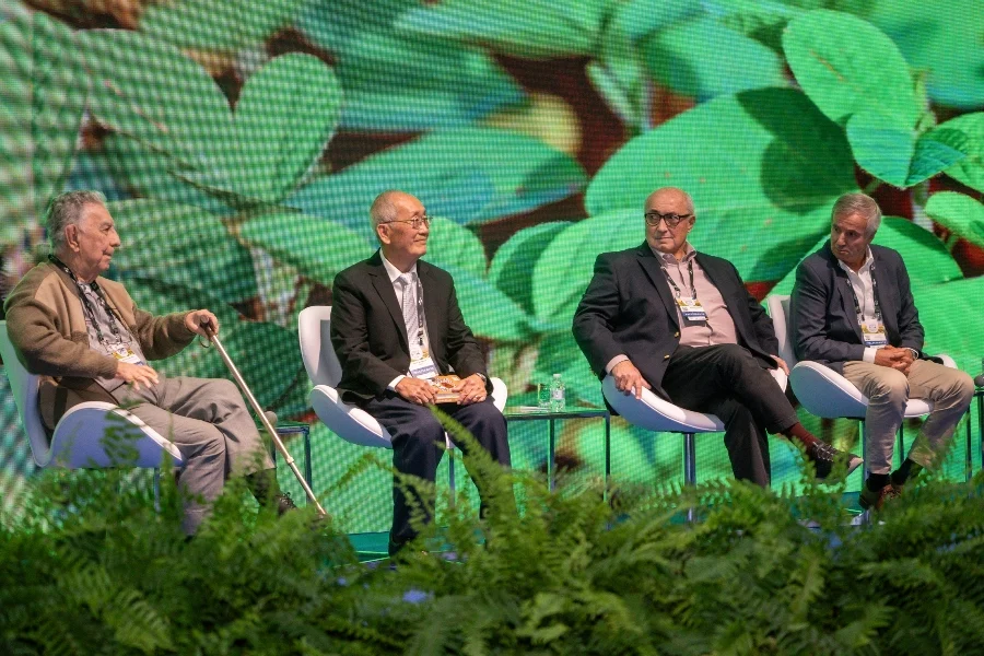 O jornalista do Canal Rural Giovani Ferreira moderou um bate-papo em que participaram Romeu Kiihl, ex-pesquisador da Embrapa e atualmente na MGS Melhoramento Genético e Sementes, considerado o pai da soja tropical; Tuneo Sediyama, professor da Universidade Federal de Viçosa e uma das referências no melhoramento genético da cultura; além de Rodolfo Luis Rossi, da Associação da Cadeia da Soja da Argentina (AC Soja) e Gerardo Bartolomé, sócio-fundador e ex-presidente do Grupo Dom Mário (GDM).