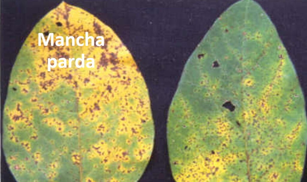 Já a mancha-parda, causada pelo fungo Septoria glycines, pode ocorrer em duas fases na cultura – no início do desenvolvimento da soja e na fase de enchimento de grãos, representando perdas que podem ultrapassar 30%. Especialmente nesse caso, cabe destacar que o fungo sobrevive após a colheita da cultura. Os períodos chuvosos são um alerta para a disseminação do patógeno do fungo e as folhas molhadas por longo período levam ao aumento da incidência e da severidade da doença.