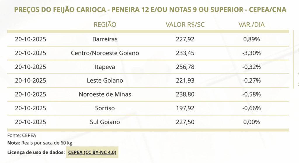 Há um ano, o setor produtivo brasileiro conta com uma ferramenta fundamental para acompanhar e entender o comportamento dos preços do feijão. Desde outubro de 2024, o Cepea (Centro de Estudos Avançados em Economia Aplicada), da Esalq/USP, em parceria com a CNA (Confederação da Agricultura e Pecuária do Brasil), divulga diariamente os valores médios de negociação dos feijões carioca e preto, dois dos mais importantes produtos da mesa do brasileiro.